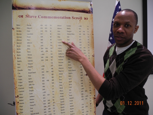 CMC Libation Ceremony, 2011: Aaron Dorsey, pointing to names of his enslaved ancestors on Slave Commemoration Scroll and Jonnie Brown with picture of one of her enslaved ancestors.